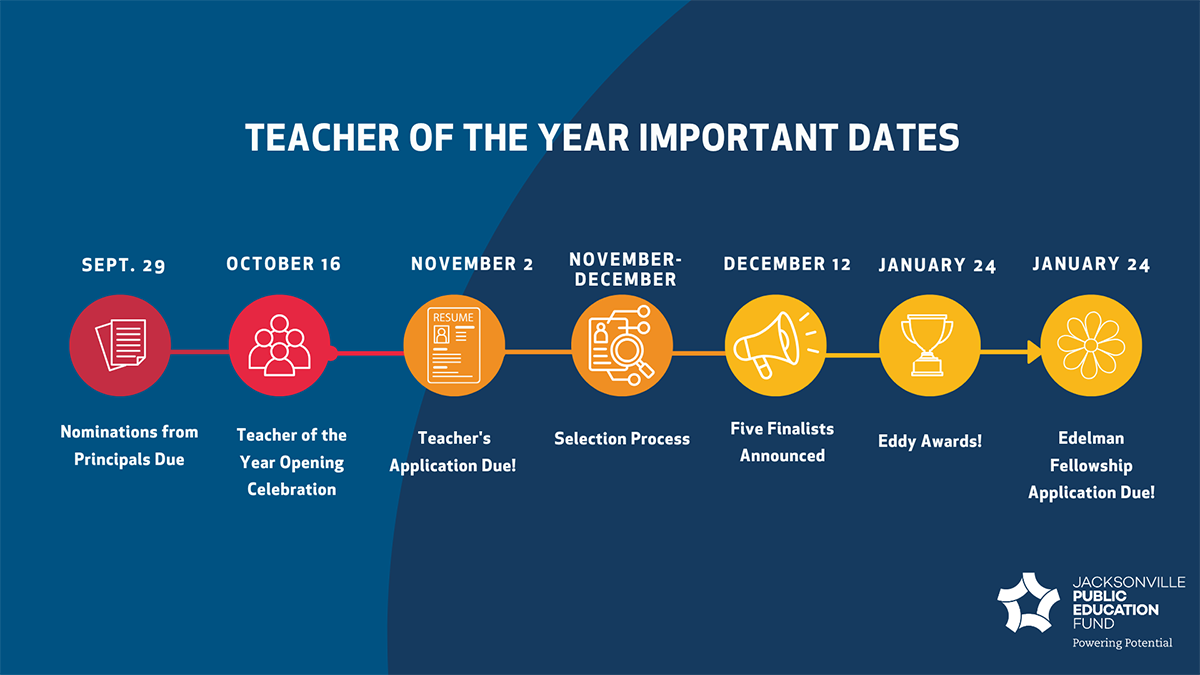 We also encourage you to share your good news and journey as a Teacher of the Year on social media! JPEF will be posting about all the Teachers of the Year, and we hope you will follow and share as we do. You can also tag JPEF (@JaxPef) as you post your own photos.